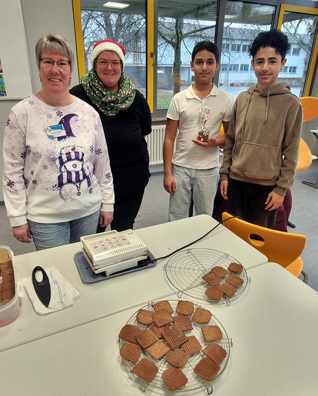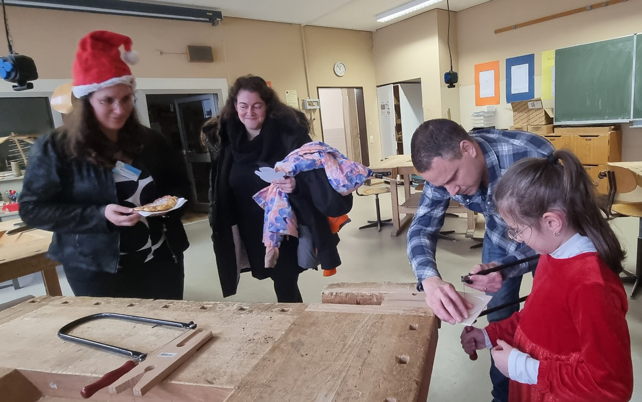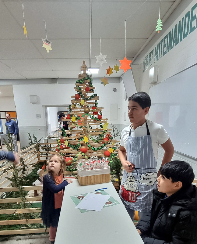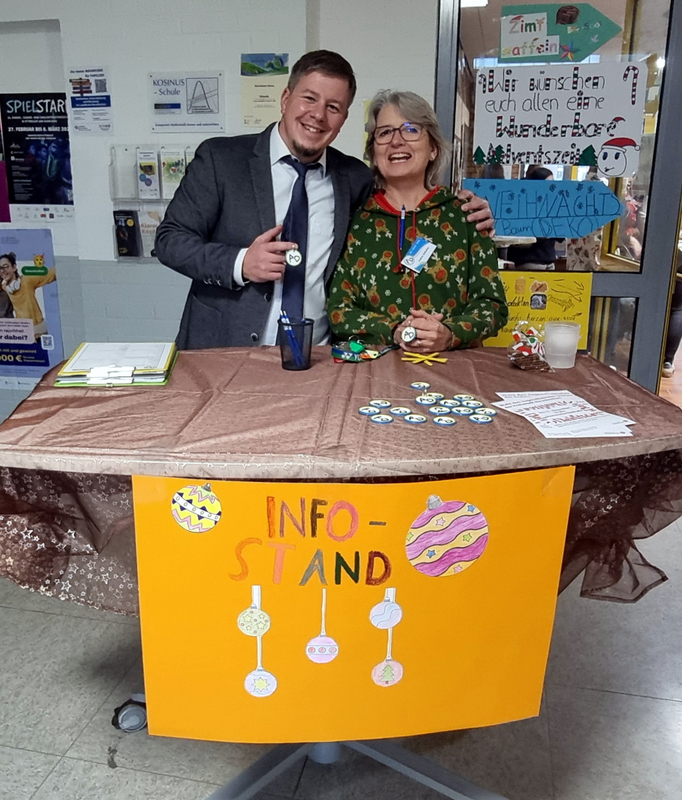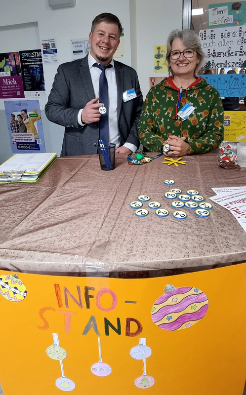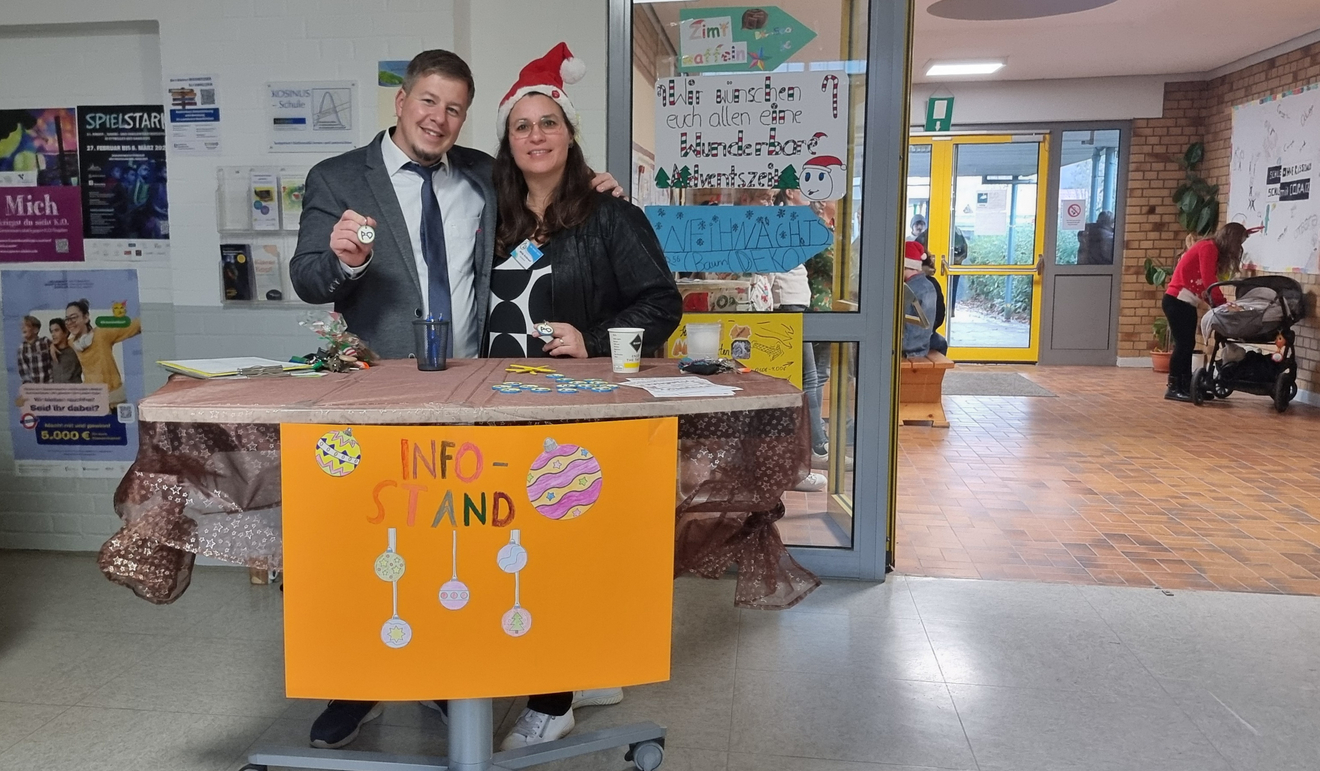 Inmitten dieses festlichen Fluidums hatte es die Schulleitung unter Ulrike Rothermel und ihrem Stellvertreter Olaf Schley wahrlich nicht leicht, einer weiteren Zielstellung an diesem Tag der offenen Schultür gerecht zu werden. Gemeint ist das Bemühen, alle interessierten Viertklässler aus benachbarten Grundschulen und ihre Eltern an einem Infostand gleich neben dem Sekretariat von den zahlreichen unterrichtlichen und organisatorischen Vorzügen einer Ganztags-Gemeinschaftsschule zu überzeugen, eventuelle Vorurteile zu zerstreuen und auf Fragen aller Art Antworten und Auskünfte zu erteilen. Unterstützung erfuhr die Schulleitung dabei auch von Schulelternsprecher Christian Jochum, der außerdem die Mitverantwortung über Kasse und Bon-Verkauf übernommen hatte. „Die Eltern haben durch ihre aktive Mitarbeit und Kuchenspenden auch diesmal einen großen Anteil zum Gelingen der weihnachtlichen Traditionsveranstaltung beigetragen, die seit 2018 in dieser erfolgreichen Kombination stattfindet“, betonte die Schulleiterin. Den familiären Charakter der kleinen Schule im Grünen sieht Ulrike Rothermel zudem durch den Besuch vieler ehemaliger Schülerinnen und Schüler bestätigt. „Dass ehemalige Schüler ihre eigenen Kinder bei uns anmelden wollen, ist Bestätigung für die gute Arbeit, die hier geleistet wird“, ergänzte sie stolz.