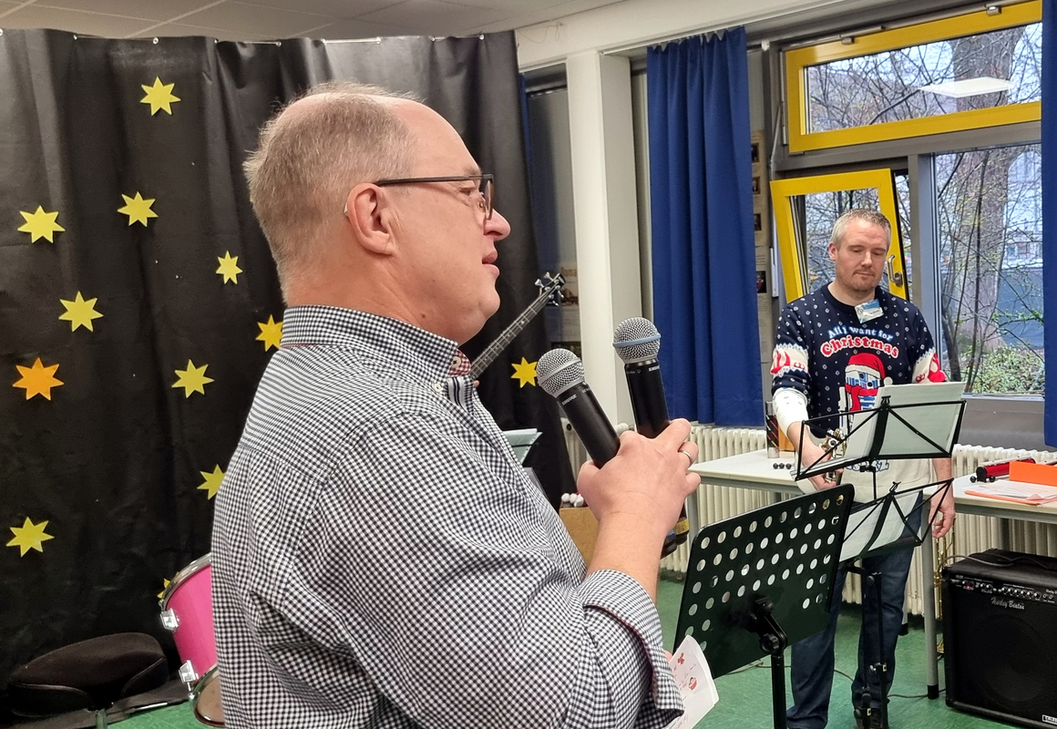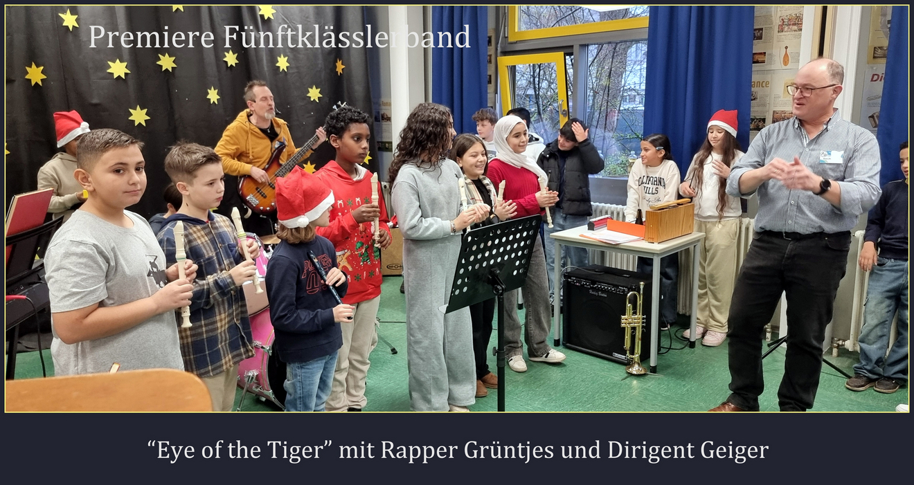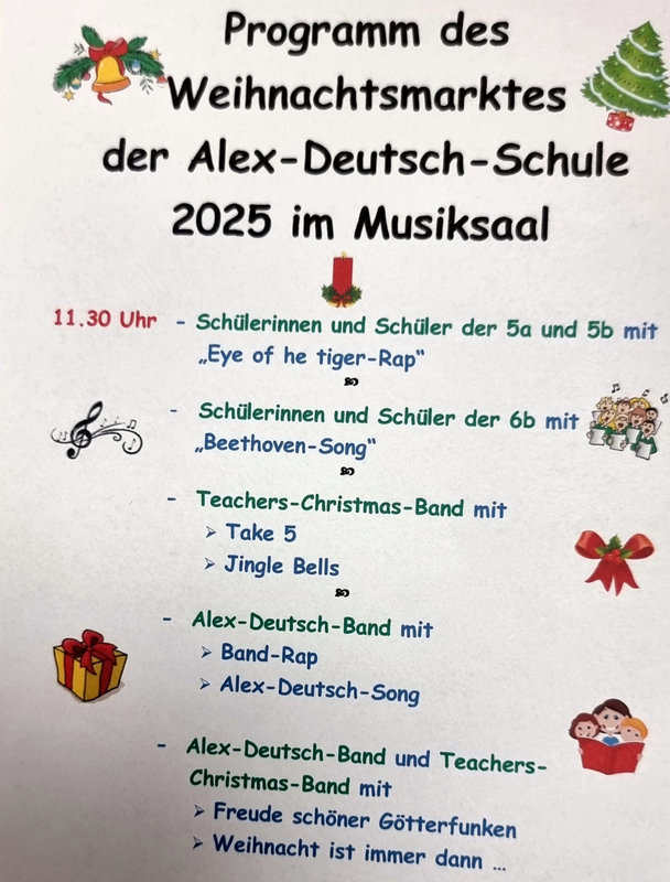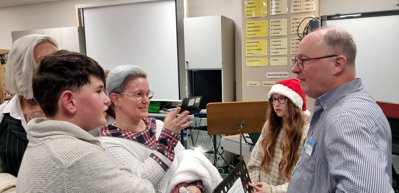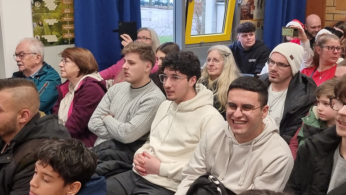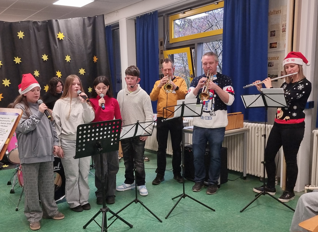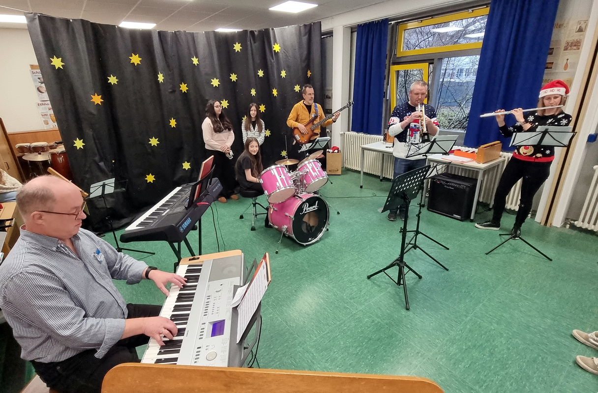 Das sprichwörtliche „Tüpfelchen auf dem i“ bildeten einmal mehr die musikalischen Beiträge verschiedener Schülergruppen und der aus vier Lehrkräften bestehenden „Teachers-Christmas-Band“ unter der Gesamtleitung von Musiklehrer und Moderator Hans-Jürgen Geiger. Das Repertoire reichte vom „Eye of the Tiger-Rap“ über den Beethoven-Song, das selbst vertonte Alex-Deutsch-Lied oder die Sinfonie „Freude schöner Götterfunken“ bis hin zum Weihnachtsklassiker „Jingle Bells“. Gut zweimal so groß hätte der Musiksaal sein dürfen, um allen interessierten Besuchern Platz bieten zu können.