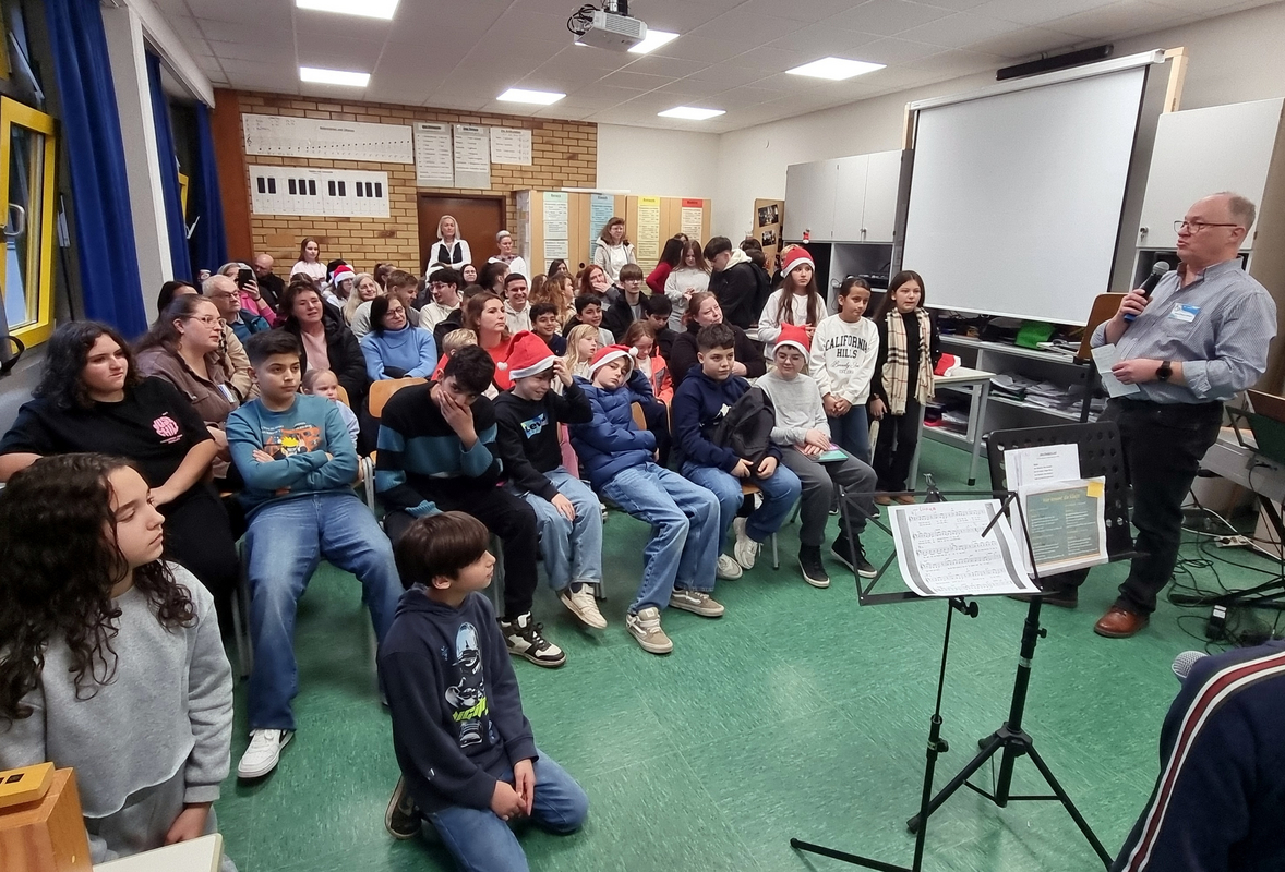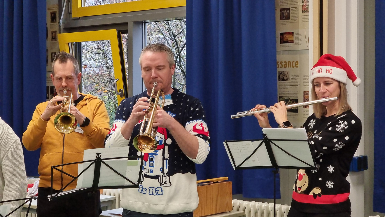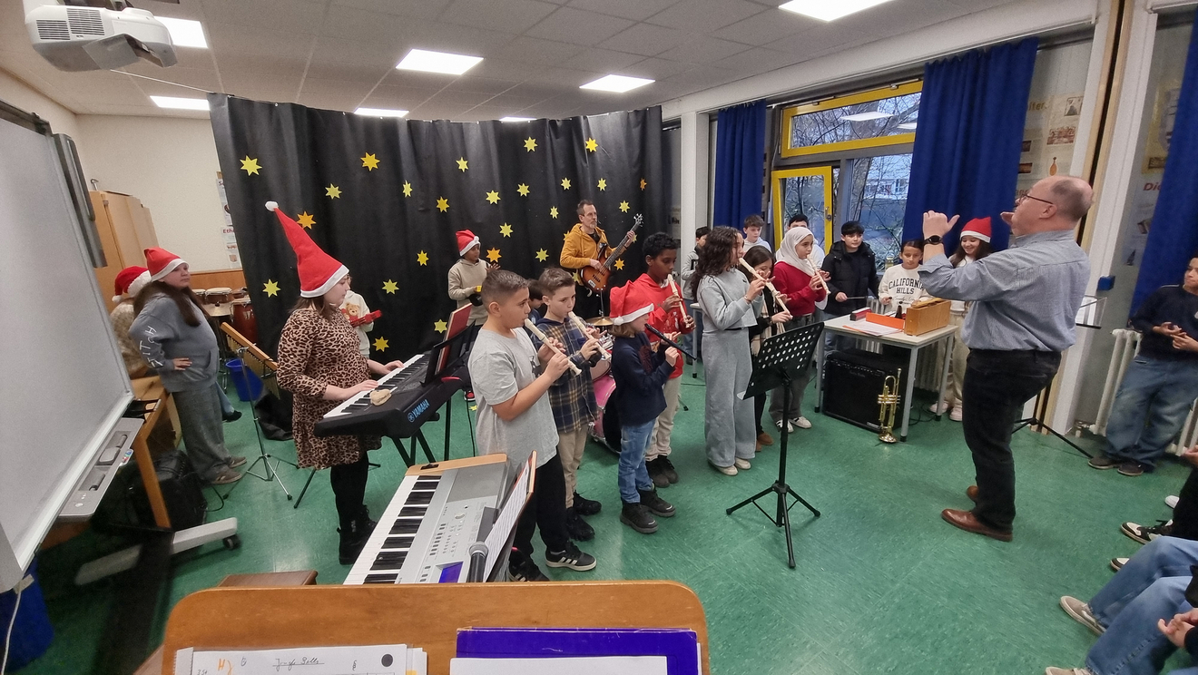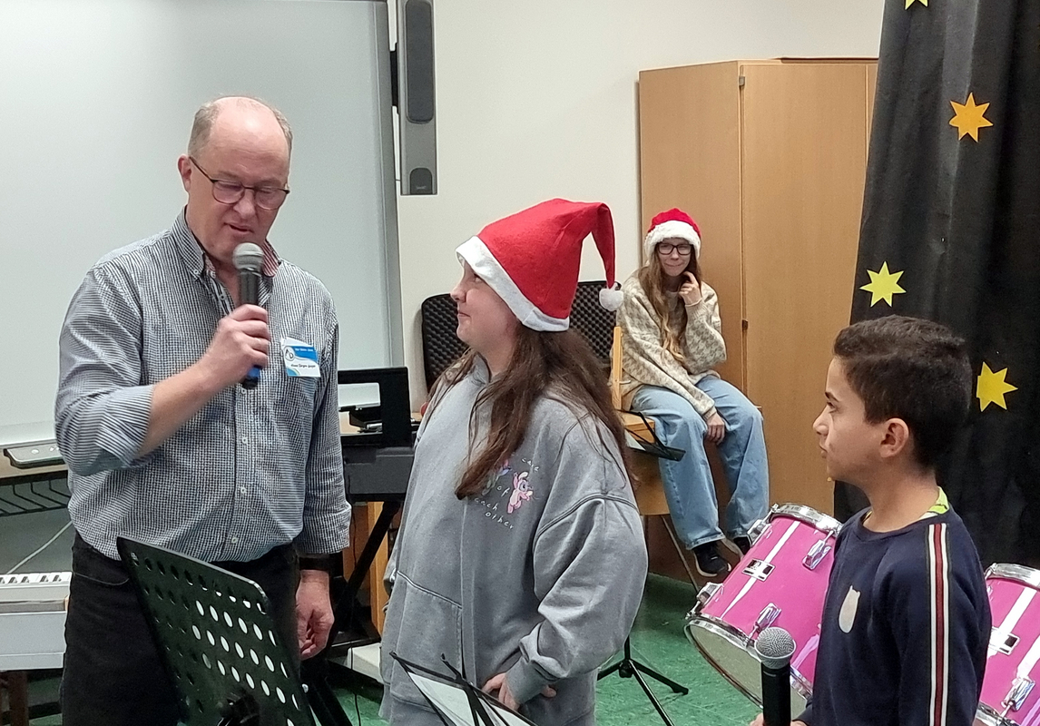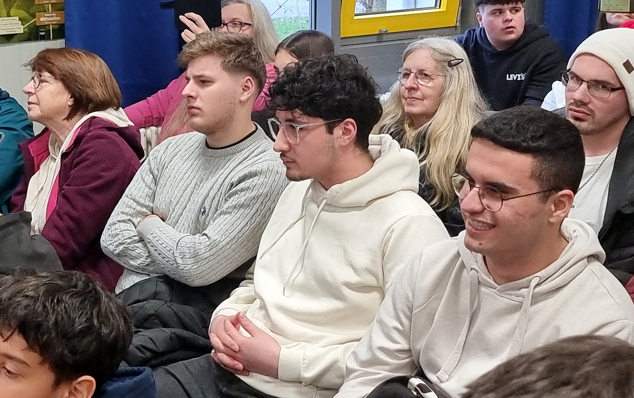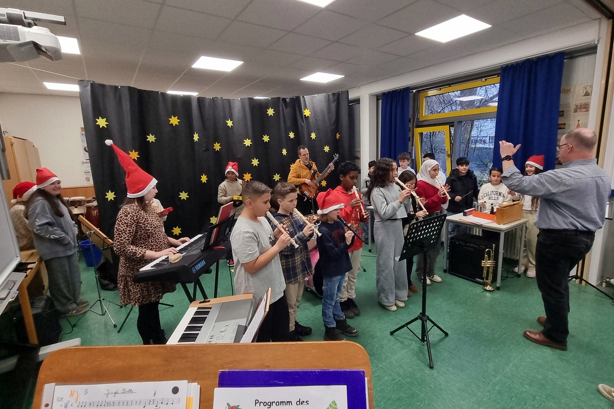 Das sprichwörtliche „Tüpfelchen auf dem i“ bildeten einmal mehr die musikalischen Beiträge verschiedener Schülergruppen und der aus vier Lehrkräften bestehenden „Teachers-Christmas-Band“ unter der Gesamtleitung von Musiklehrer und Moderator Hans-Jürgen Geiger. Das Repertoire reichte vom „Eye of the Tiger-Rap“ über den Beethoven-Song, das selbst vertonte Alex-Deutsch-Lied oder die Sinfonie „Freude schöner Götterfunken“ bis hin zum Weihnachtsklassiker „Jingle Bells“. Gut zweimal so groß hätte der Musiksaal sein dürfen, um allen interessierten Besuchern Platz bieten zu können.