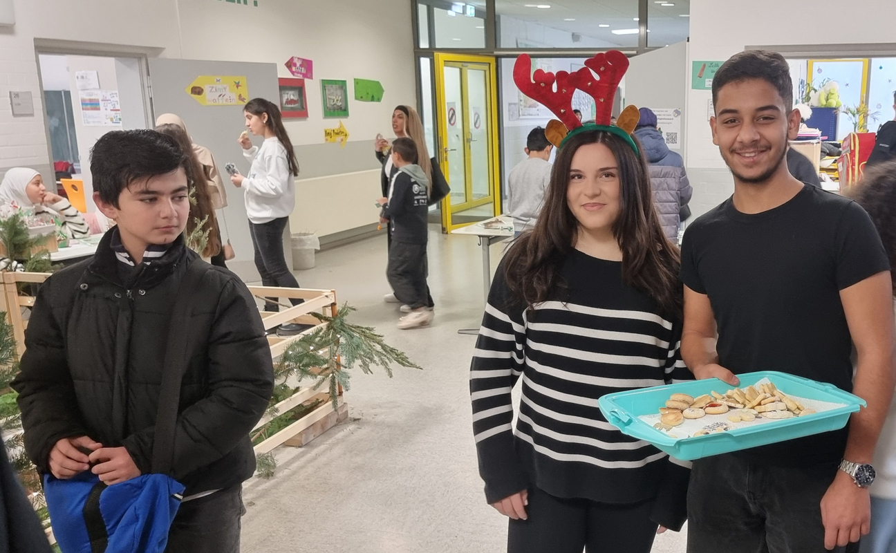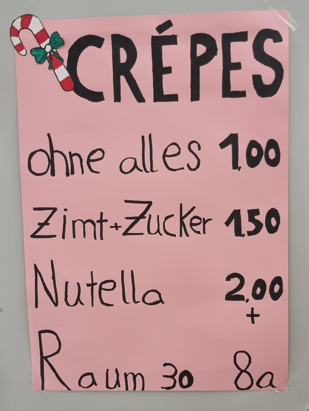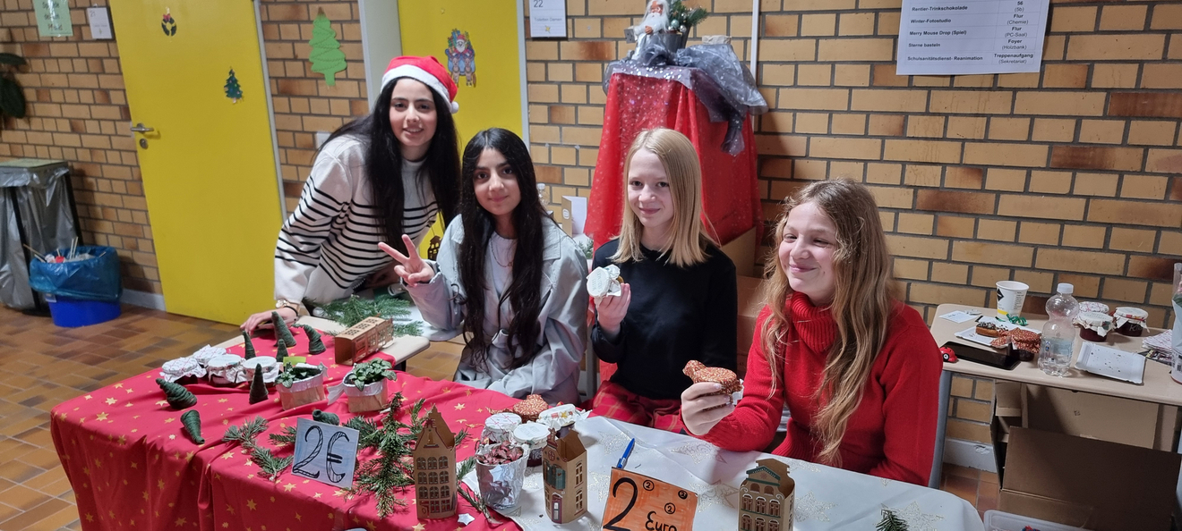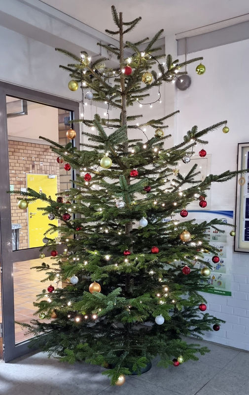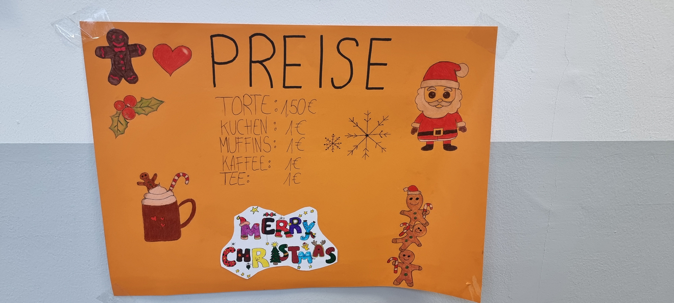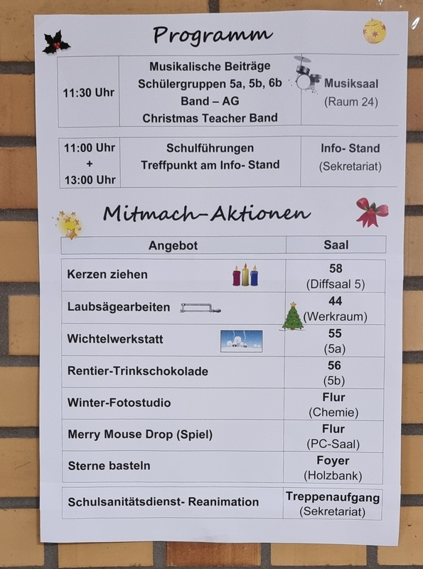 Kunstvoll gestaltete Hinweisschilder, der betörende Duft nach Selbstgebackenem, weihnachtliche Klänge aus vielen Sälen und vor allem ein prächtig geschmückter Tannenbaum im Foyer nebst einem zauberhaften Weihnachtsarrangement an zentraler Stelle der Schule ließen keinen Zweifel daran aufkommen, dass Weihnachten naht, das Fest der Liebe, des Friedens und der Freude.