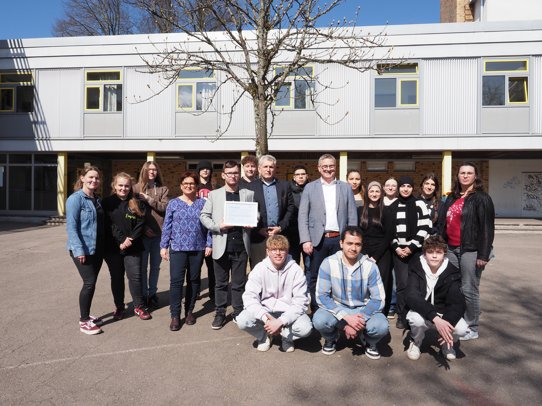Zusätzlich gingen 800,- € als Sonderpreis der KEW an die vier Teams für die sehr gelungenen Rechercheleistungen im KEW-Versorgungsgebiet. Der Preis wurde samt Urkunden und Powerbanks überreicht von Marcel Dubois, Vorstand der KEW. Die somit insgesamt 1.600,- für die Klassenkasse wurden am 27.03.2025 von der Physiklehrerin Eva Wabnitz-Hartmann, die die vier Arbeiten würdigte, den Gewinnerteams und der ganzen Klasse im Beisein der mit ihren Schülerinnen und Schülern sehr zufriedenen Schulleiterin Ulrike Rothermel und Klassenlehrerin Laura Schäfer begeistert entgegengenommen. Der Verwendungszweck ist auch schon klar. Damit wird die Abschlussfahrt der Klasse 10a mitfinanziert.
