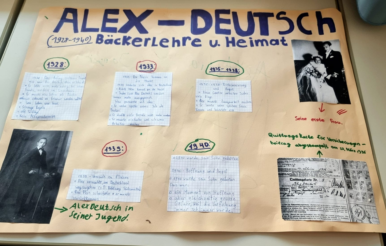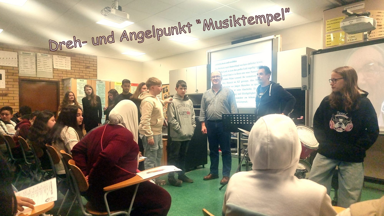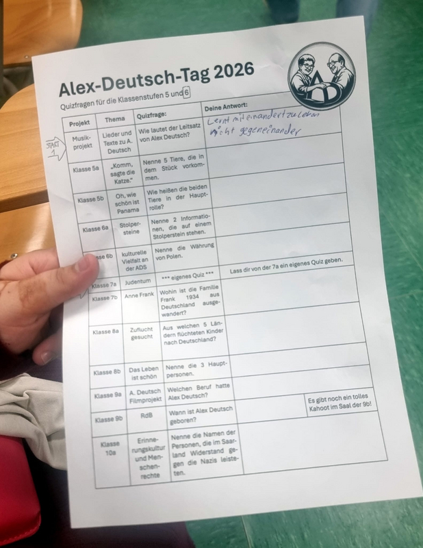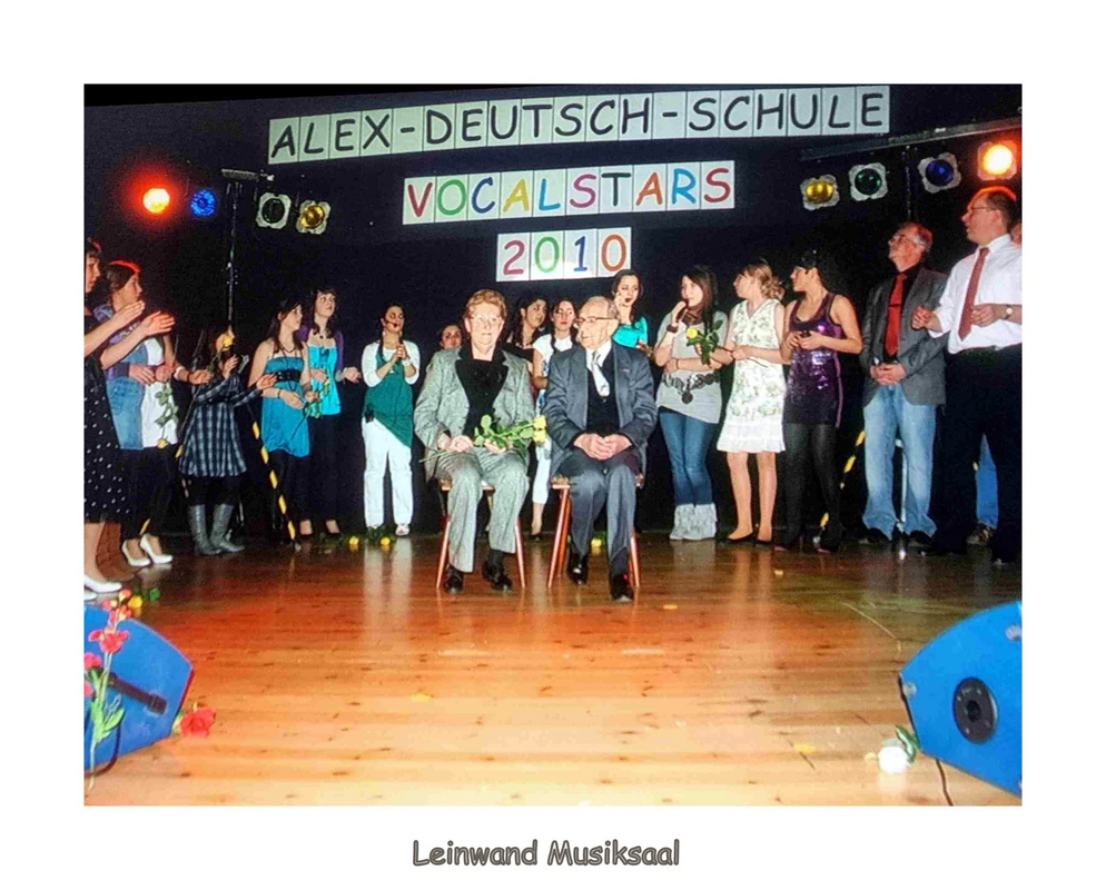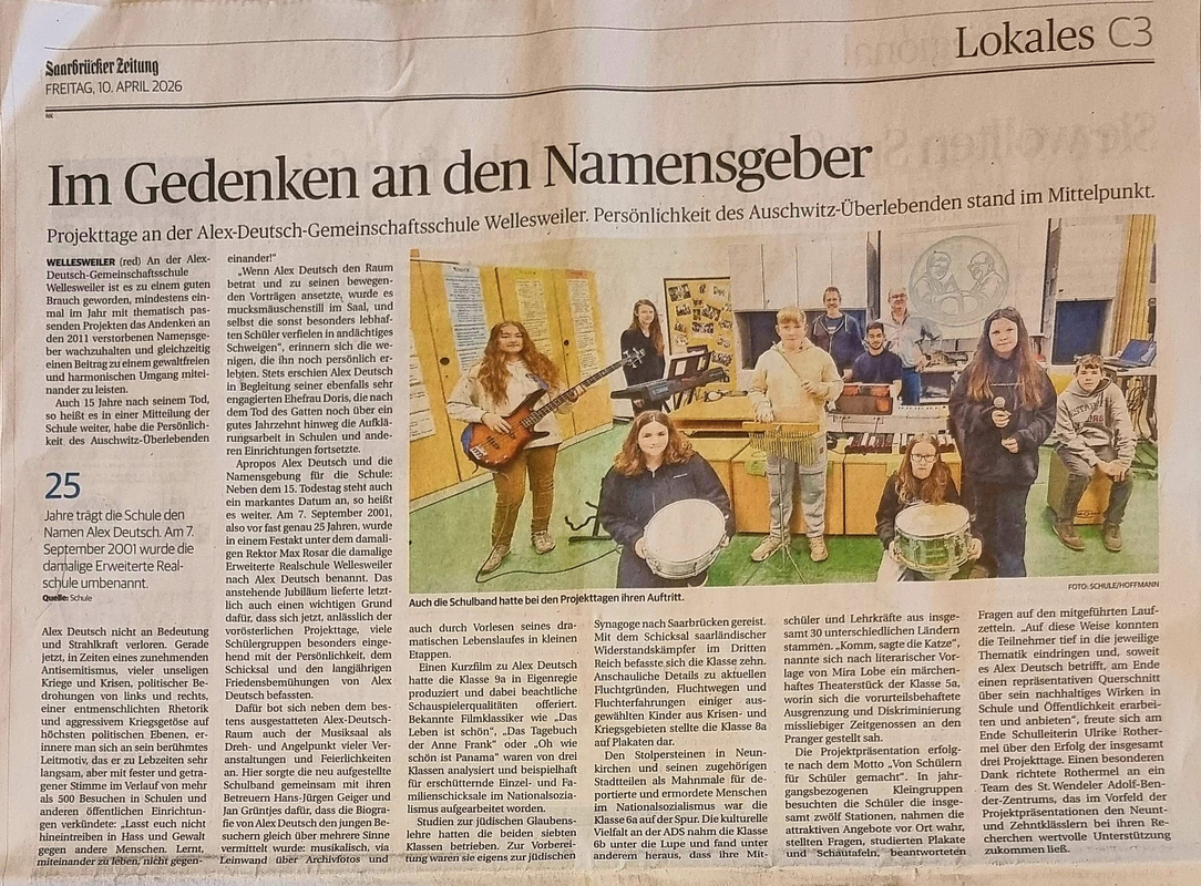 Auch 15 Jahre nach seinem Tod hat die Persönlichkeit des Auschwitz-Überlebenden Alex Deutsch nicht an Bedeutung und Strahlkraft verloren. Gerade jetzt, in Zeiten eines zunehmenden Antisemitismus, vieler unseligen Kriege und Krisen, politischer Bedrohungen von links und rechts, einer entmenschlichten Rethorik und aggressivem Kriegsgetöse auf höchsten politischen Ebenen, erinnert man sich an sein berühmtes Leitmotiv, das er zu Lebzeiten sehr langsam, aber mit fester und getragener Stimme im Verlauf von mehr als 500 Besuchen in Schulen und anderen öffentlichen Einrichtungen verkündete: „Lasst euch nicht hineintreiben in Hass und Gewalt gegen andere Menschen. Lernt miteinander zu leben, nicht gegeneinander!“ „Wenn Alex Deutsch den Raum betrat und zu seinen bewegenden Vorträgen ansetzte, wurde es mucksmäuschenstill im Saal und selbst die sonst besonders lebhaften Schüler verfielen in andächtiges Schweigen“, erinnern sich die wenigen, die ihn noch persönlich erlebten. Stets erschien Alex Deutsch in Begleitung seiner ebenfalls sehr engagierten Ehefrau Doris, die nach dem Tod des Gatten noch über ein gutes Jahrzehnt hinweg die Aufklärungsarbeit in Schulen und anderen Einrichtungen fortsetzte. Apropos Alex Deutsch und die Namensgebung für die Schule. Neben dem 15. Todestag steht auch diesbezüglich ein markantes Datum an. Am 7. September 2001, also vor fast genau 25 Jahren, wurde in einem Festakt unter dem damaligen Rektor Max Rosar die damalige Erweiterte Realschule Wellesweiler nach Alex Deutsch benannt. Das anstehende Jubiläum lieferte letztlich auch einen wichtigen Grund dafür, dass sich jetzt, anlässlich der vorösterlichen Projekttage, viele Schülergruppen besonders eingehend mit der Persönlichkeit, dem Schicksal und den langjährigen Friedensbemühungen von Alex Deutsch befassten. Dafür bot sich neben dem bestens ausgestatteten Alex-Deutsch-Raum auch der Musiksaal als Dreh- und Angelpunkt vieler Veranstaltungen und Feierlichkeiten schlechthin an. Hier sorgte die neu aufgestellte Schulband gemeinsam mit ihren Betreuern Hans-Jürgen Geiger und Jan Grüntjes dafür, dass die Biografie von Alex Deutsch den jungen Besuchern gleich über mehrere Sinne vermittelt wurde: musikalisch, via Leinwand über Archivfotos und auch durch Vorlesen seines dramatischen Lebenslaufes in kleinen Etappen.