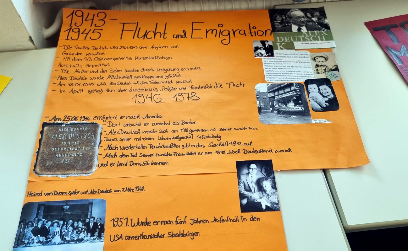 Alex Deutsch wuchs als deutscher Jude in Berlin auf. 1943 wurde er mit seiner jungen Familie ins KZ Auschwitz deportiert. Seine erste Frau Thea und der zweijährige Sohn Dennis wurden gleich nach ihrer Ankunft ermordet. Alex Deutsch überlebte den Holocaust. Seine anfänglichen Rachegedanken wandelte der spätere Wahl-Saarländer in die Lebensaufgabe um, als Zeitzeuge vornehmlich in Schulen aufzutreten und die Jugendlichen durch fesselnde Vorträge zu mehr Mitmenschlichkeit und Toleranz anzuhalten. Im Jahre 2001 wurde die Erweiterte Realschule Wellesweiler nach dem Wiebelskircher Friedensbotschafter und Aufklärer gegen den Nationalsozialismus benannt. Doris Deutsch setzte noch sehr lange das Lebenswerk ihres 2011 verstorbenen Mannes fort.