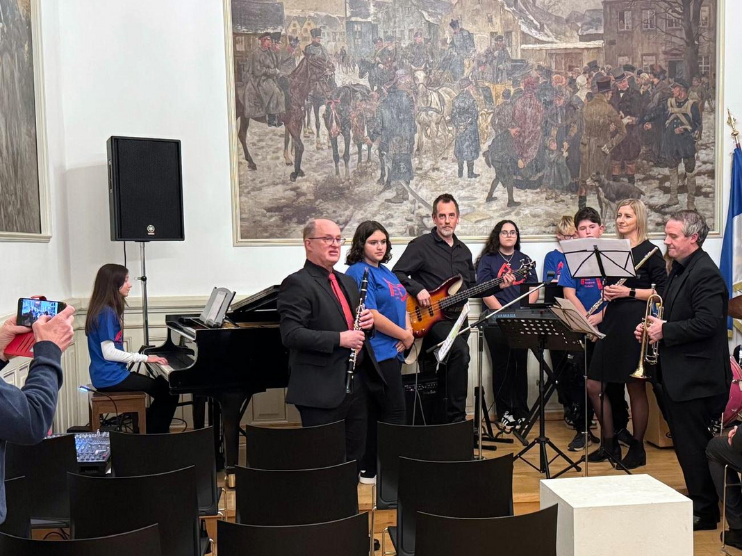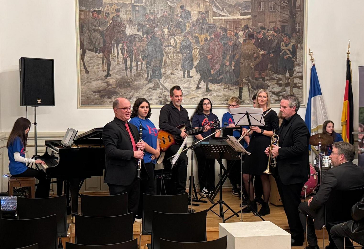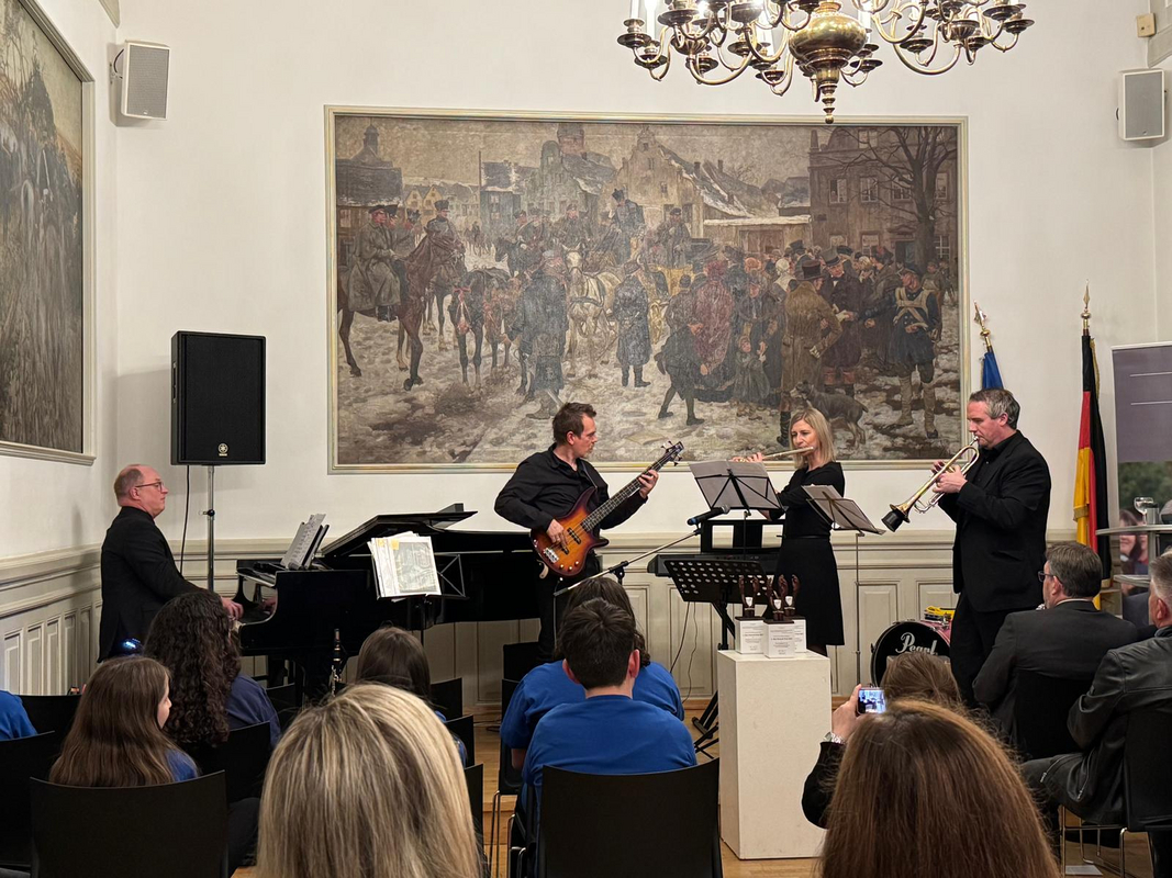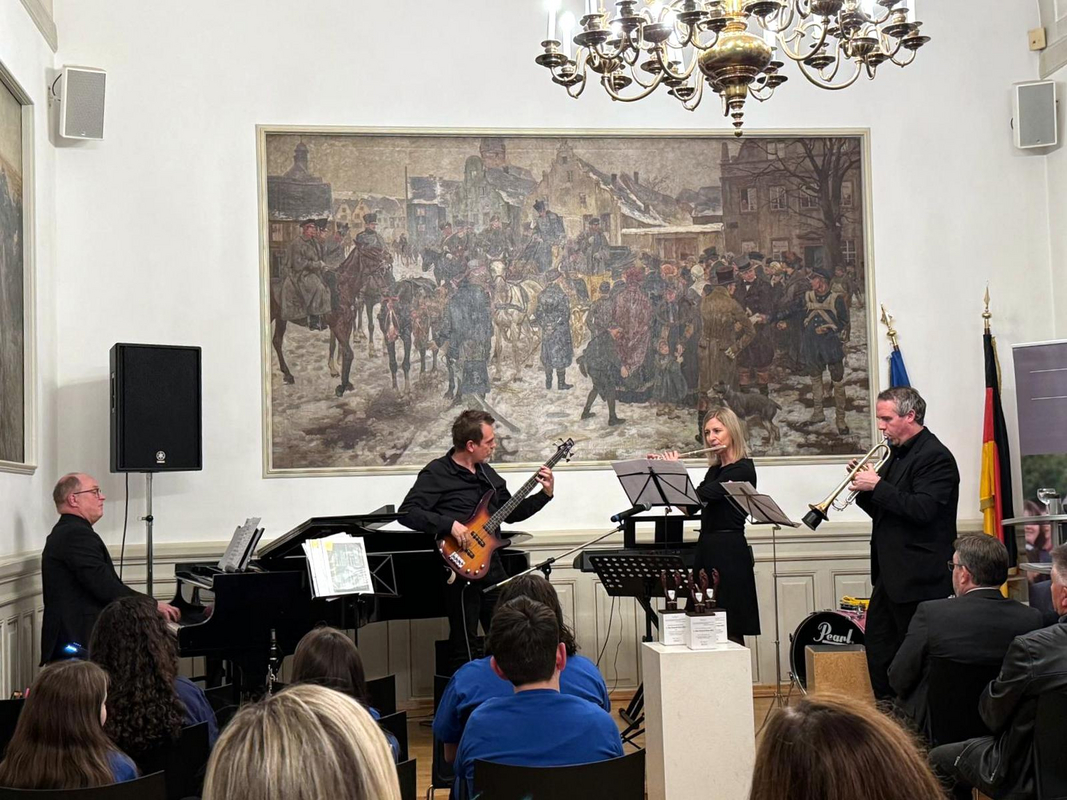 Die Lehrerband betrat auch diesmal in bewährt professioneller Besetzung mit Hans-Jürgen Geiger (Klarinette und Klavier), Andrea Moll (Querflöte), Jan Grüntjes (Bassgitarre) und Christian Eisenla (Trompete) das elegante Parkett im eindrucksvollen Sitzungssaal und versetzte zunächst das aufmerksame Publikum mit der bekannten Jazz-Melodie „Take Five“ in rhythmische Schwingungen. Getragener und Gänsehautfeeling erweckend wirkte dahingehend die spätere Melodie unter dem Titel „Thema aus Schindlers Liste“, gefühlvoll im klassischen Duett und auch namentlich durchaus passend von Andrea Moll an der Querflöte und Hans-Jürgen Geiger am Klavier zelebriert.