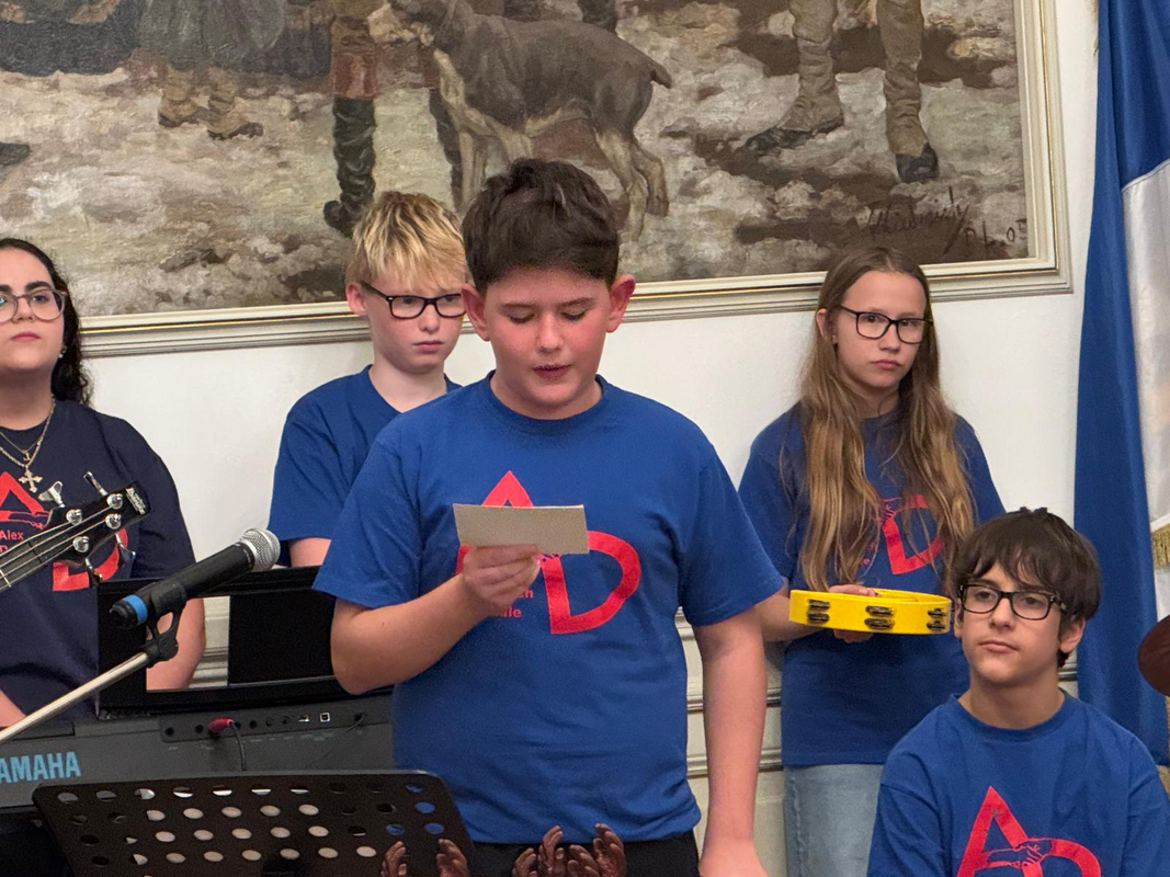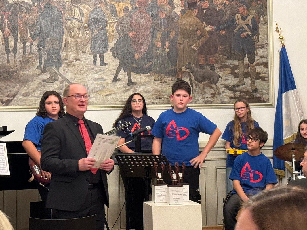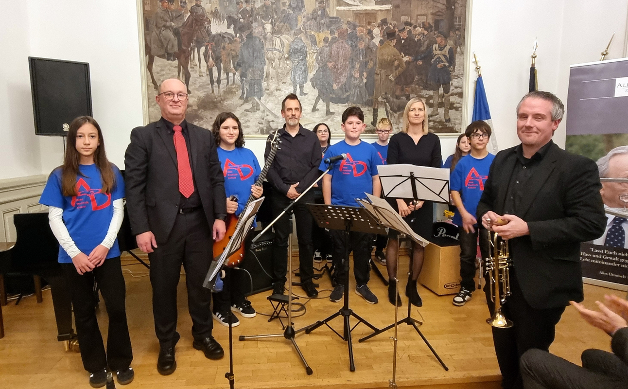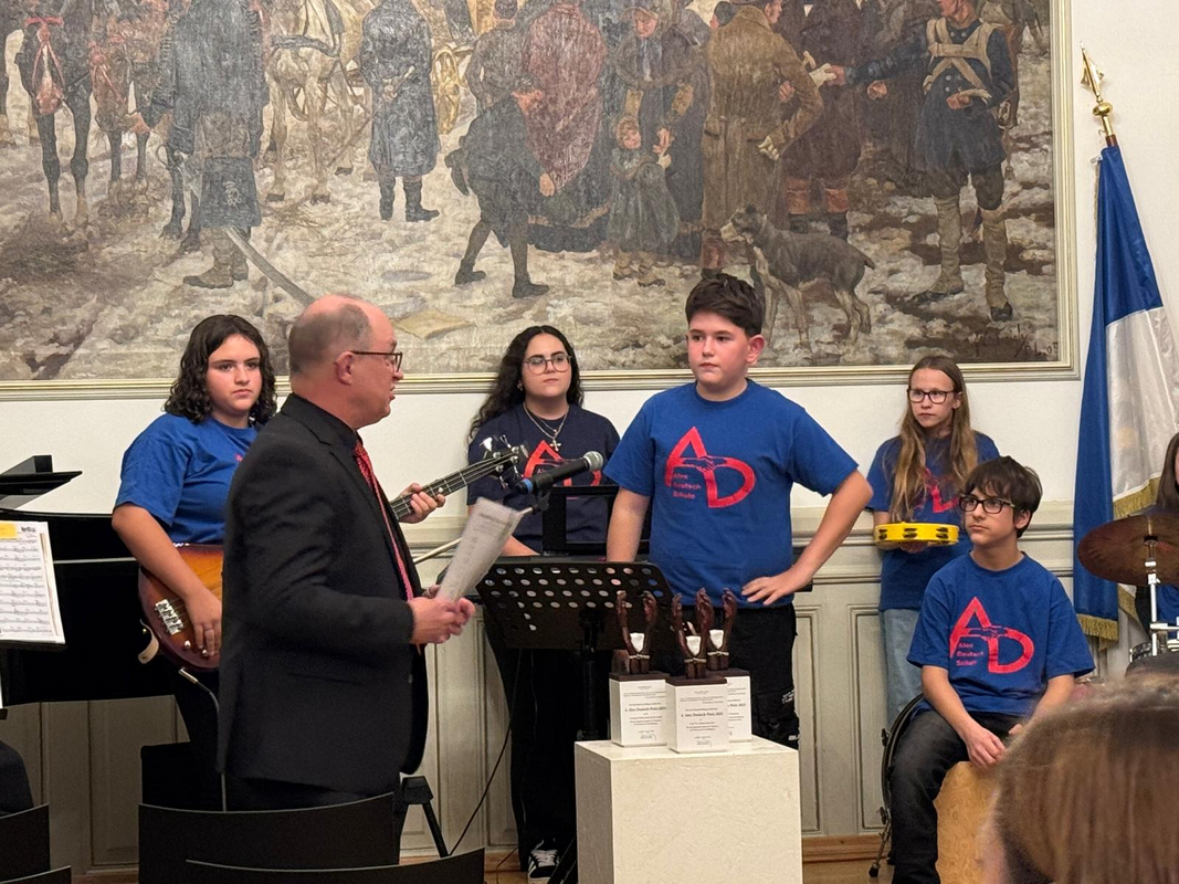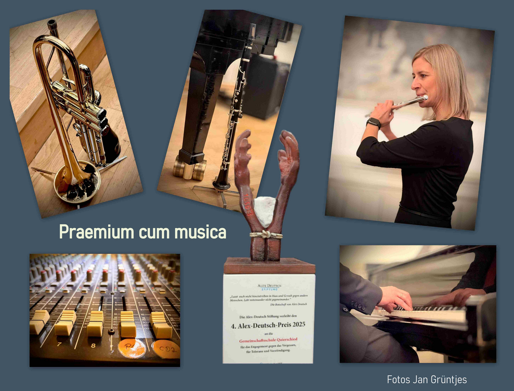 Mit einem schwungvollen Band-Rap sorgte die junge Truppe für den musikalischen Auftakt und begeisterte nur wenig später mit dem selbst vertonten „Alex-Deutsch-Song“, eine treffliche Hommage in Erinnerung an den schulischen Namensgeber. Den musikalischen Ausklang teilten sich Lehrer und Schüler in besonderer Weise. Während die Lehrer die Europahymne „Ode an die Freude“ (getextet von Friedrich Schiller und vertont von Ludwig van Beethoven) instrumental schwungvoll, ja geradezu „euphorisch“ vortrugen, überraschte die Schülerband übergangslos mit einer jugendgemäßen Rap-Variante desselben Werkes.