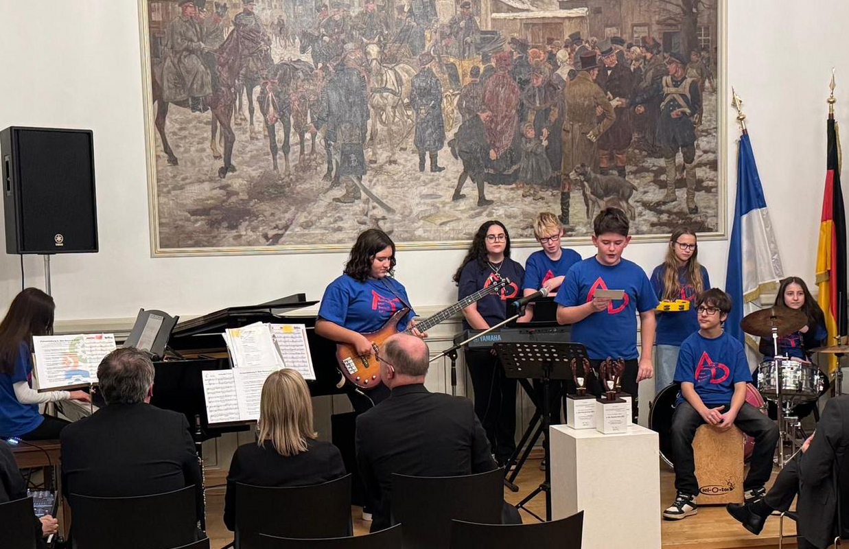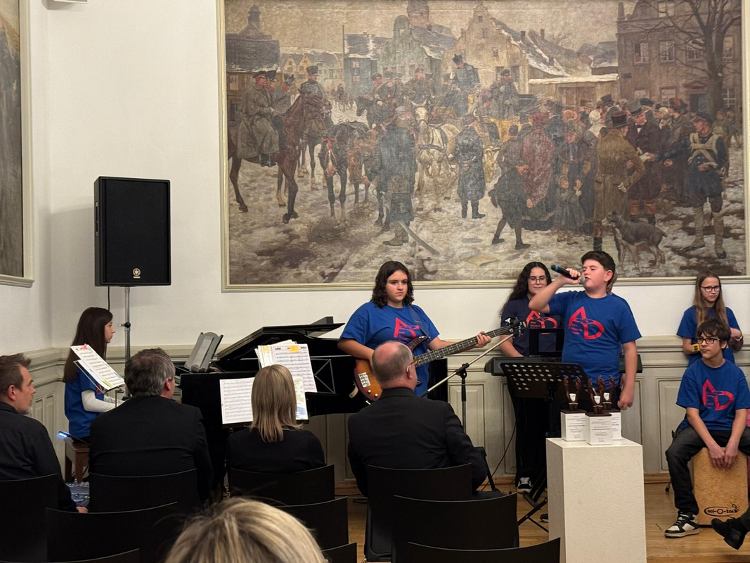 Ein Novum bei der vierten und damit jüngsten Ausgabe der Verleihung am 3. November im Historischen Sitzungssaal des Landratsamtes in Ottweiler bot nach Worten von Musik-Fachleiter Hans-Jürgen Geiger die achtköpfige Schülerband, die sich diesmal ausnahmslos aus Mädchen und Jungen einer einzigen Klasse, nämlich der Klasse 7b, rekrutierte. An der Spitze gefiel Sänger und Frontmann Michael Wakula und auch im Weiteren offenbarten Lenja Kaiser (Percussion), Conner Kühner (Drums), Emely Rau (Klavier), Elias Reichert (Keyboard), Emilia Rocca (E-Bass), Cloey Roos (Drums) und Laura Sartori (Keyboard) beachtliche musikalische Qualitäten.