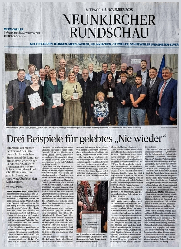 Alle Gäste, Landrat und Laudator Sören Meng sowie Überraschungs-Ehrengast Doris Deutsch zeigten sich bewegt über die musikalische und sozusagen generationenübergreifende Umrahmung einer erneut beeindruckenden Veranstaltung, in welcher die Evangelische Kita Ottweiler-Steinbach, die Gemeinschaftsschule Quierschied mit ihrem „Projektmotor“ Dr. Harald Klein und der Einzelpreisträger Professor Roland Rixecker für ihr ganz besonderes Engagement geehrt und ausgezeichnet wurden.